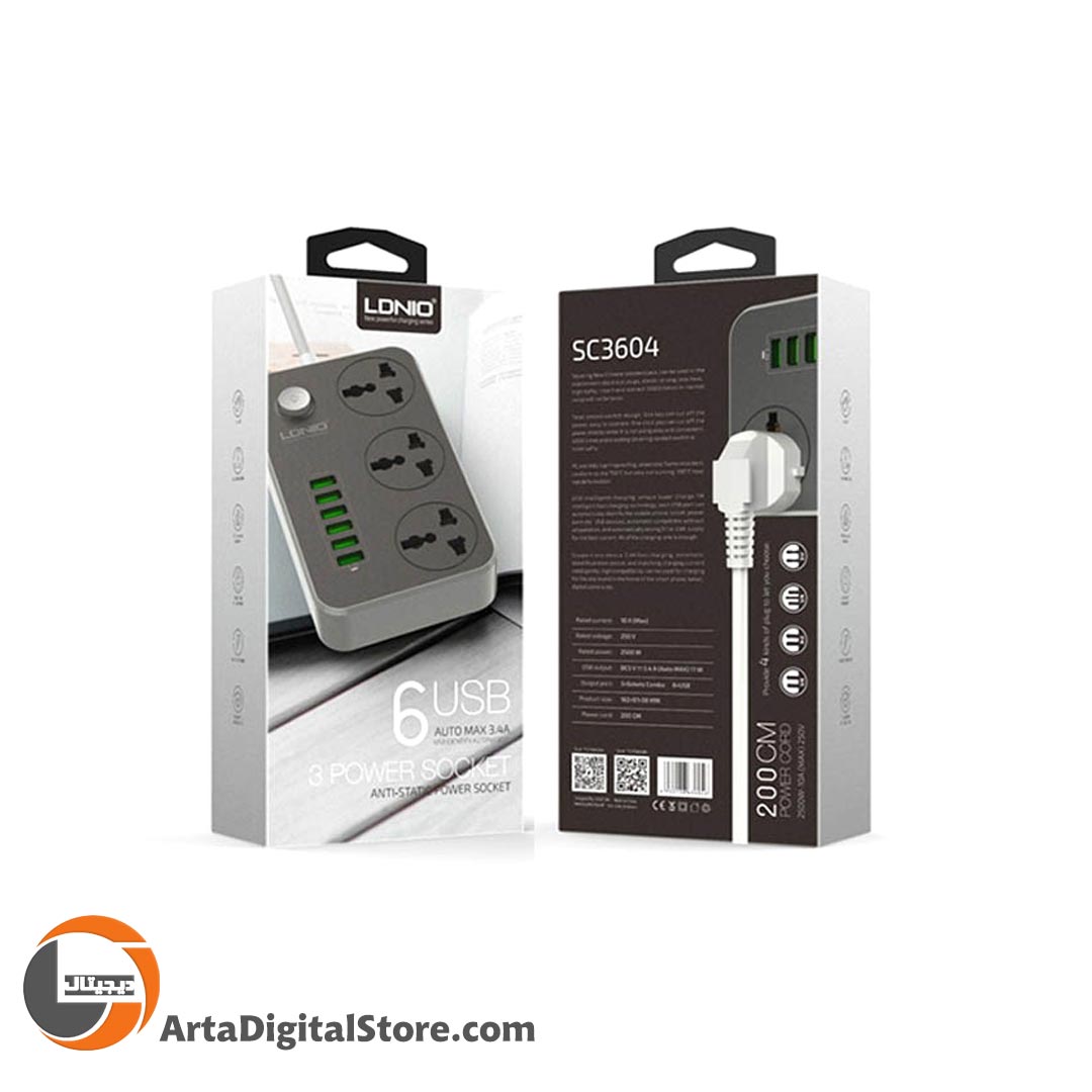 چند راهی و محافظ برق LDNIO SC3604 Power Strip 3 Socket 6 Port USB Black طول 2m